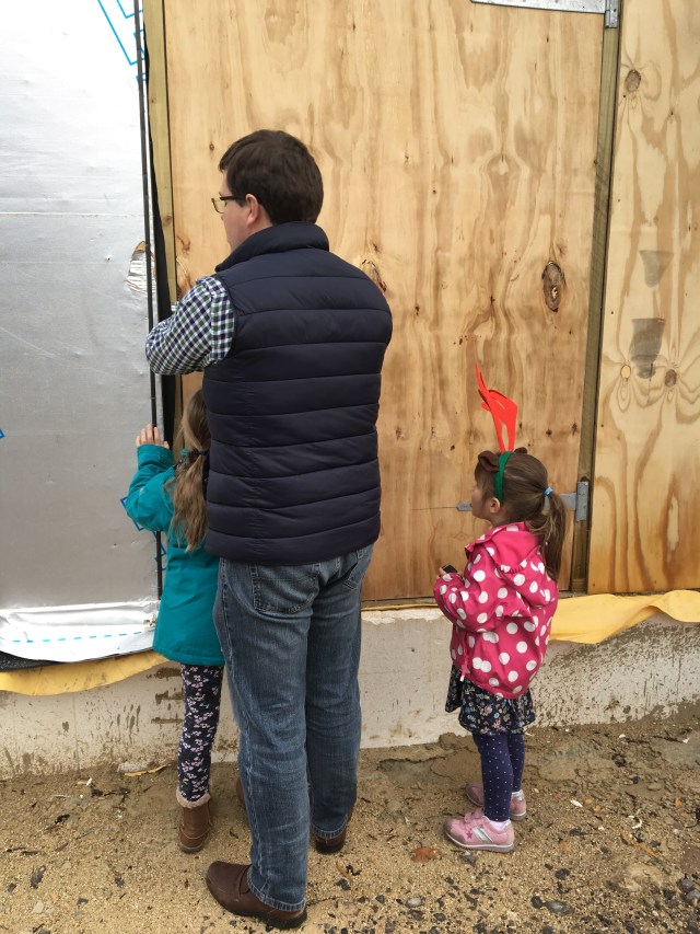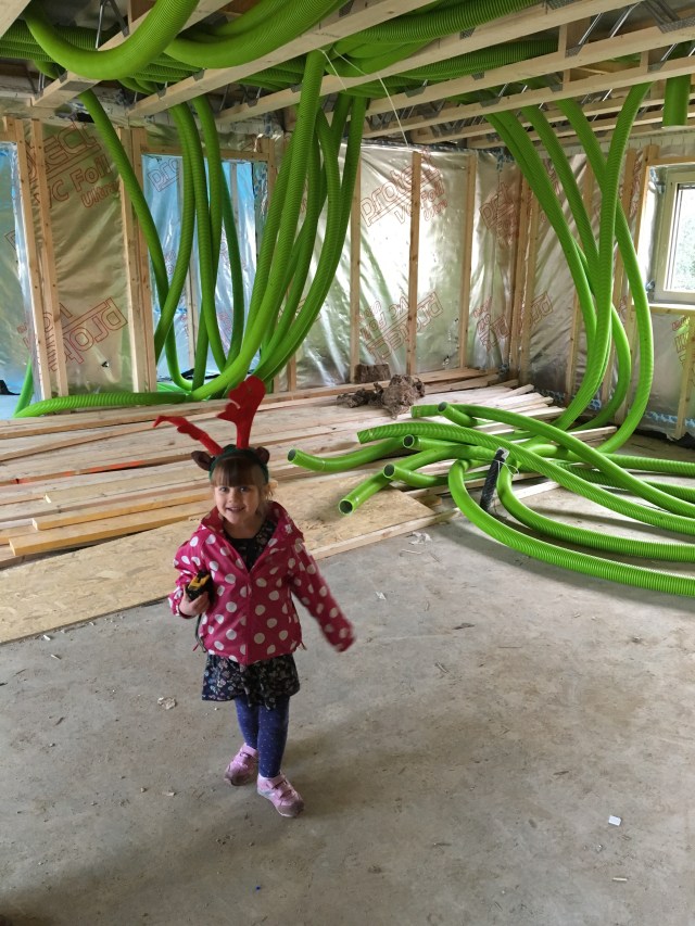 This week we went to the house and it had lots of green pipes on the kitchen floor and the ceiling. Daddy says this is the MVHR but I think they look like spaghetti!