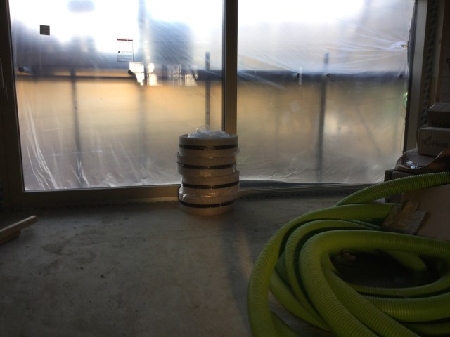 The builders covered the windows with sheets to protect the glass when they are building the stone walls.