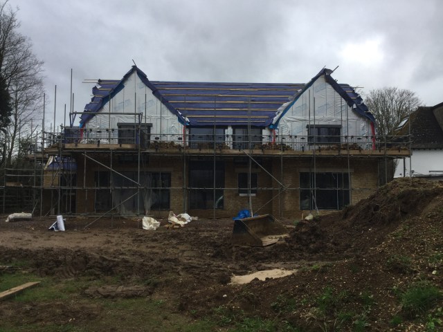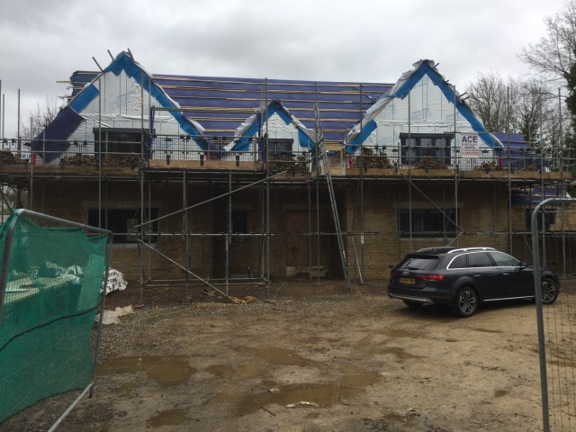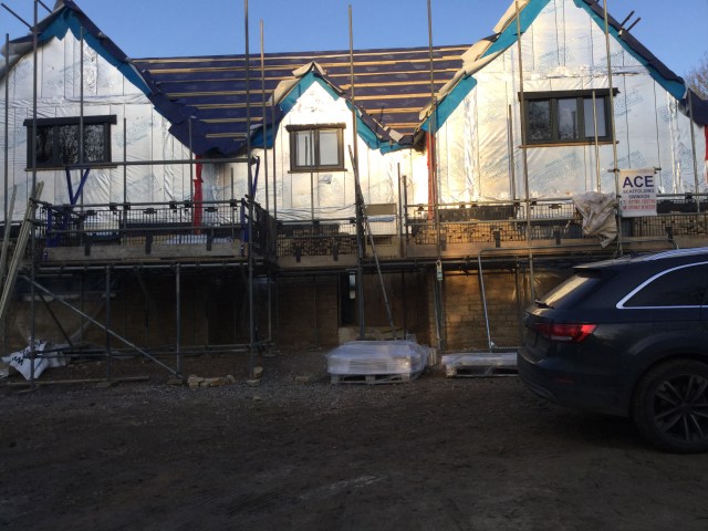At the back of the house the stone is looking nice but I want to see the tiles go on the roof!